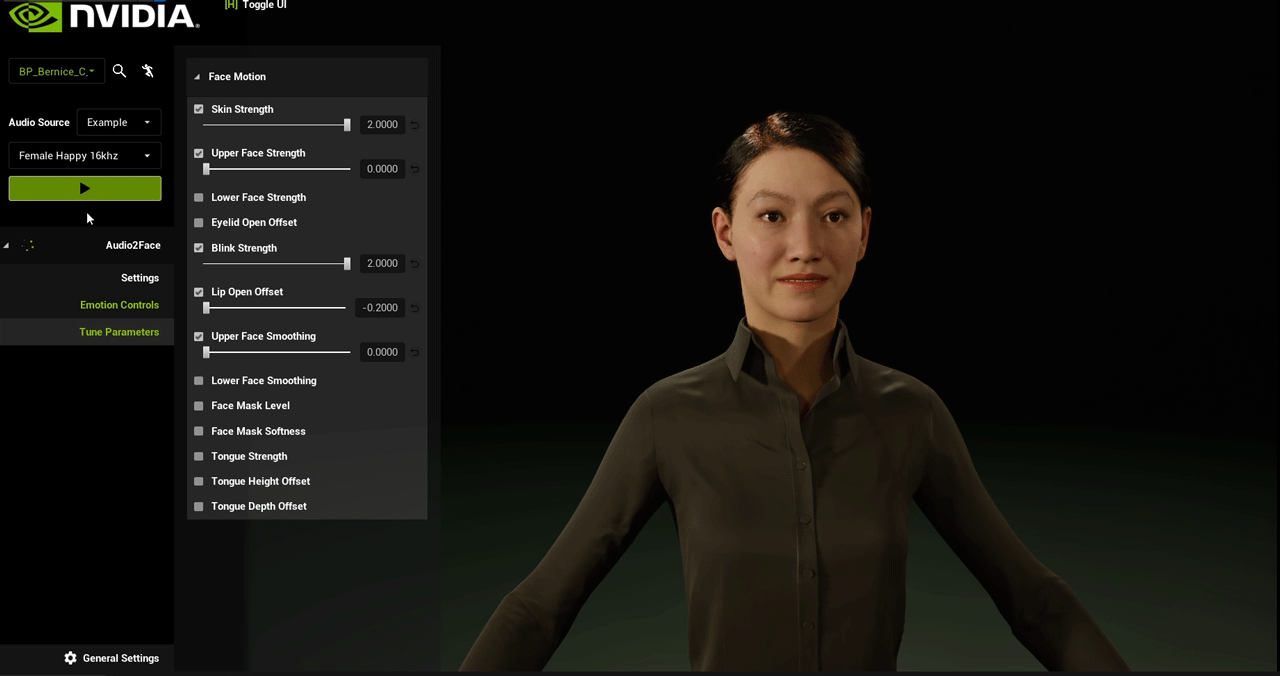Once an Audio2Face-3D service endpoint is set up, Unreal Engine can be used to render animation data received from the service. Such an endpoint requires a bidirectional Audio2Face-3D which you can set up in a Audio2Face-3D NIM Container Deployment and Configuration Guide.