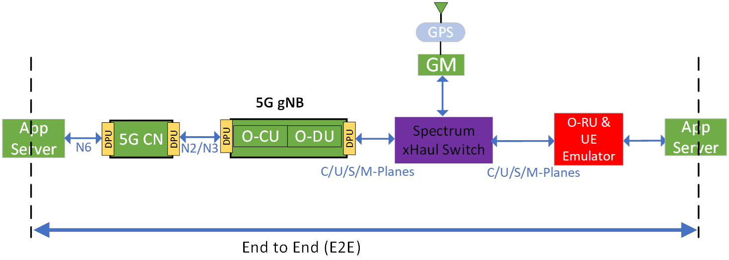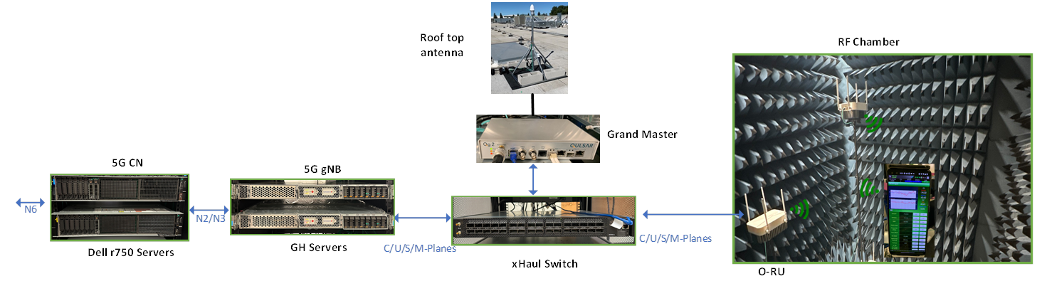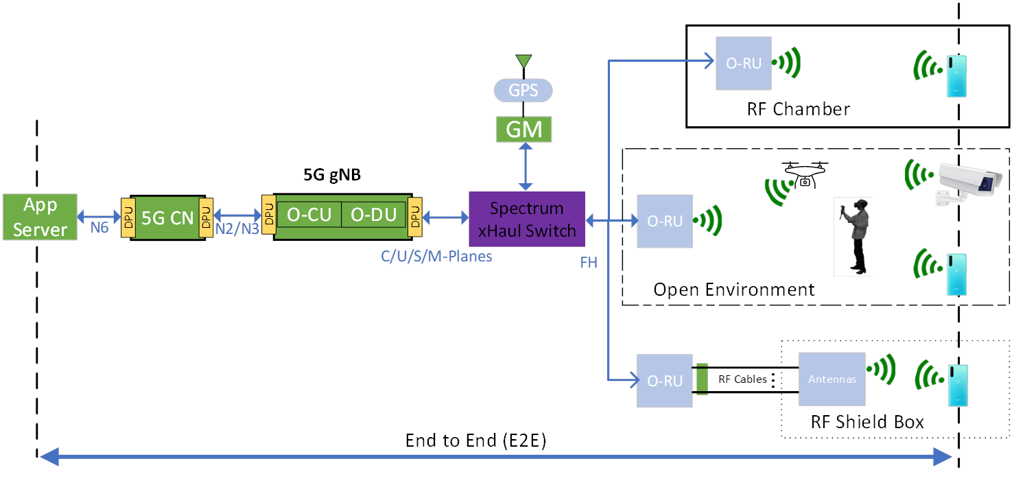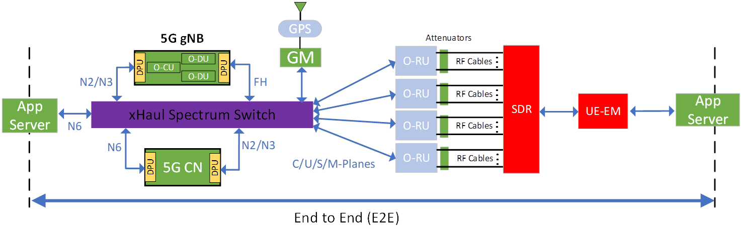 An E2E design methodology is used ensure accurate and comprehensive Aerial validation testing. The methodology begins with a eCPRI setup that is based on the O-RAN FH interface to focus on new feature integration with the ability to scale performance. The next setup includes the O-RU and includes RF cabled interfaces. Lastly, there is an OTA setup where the RF cables in the previous setup have been removed and the antennas have been inserted.