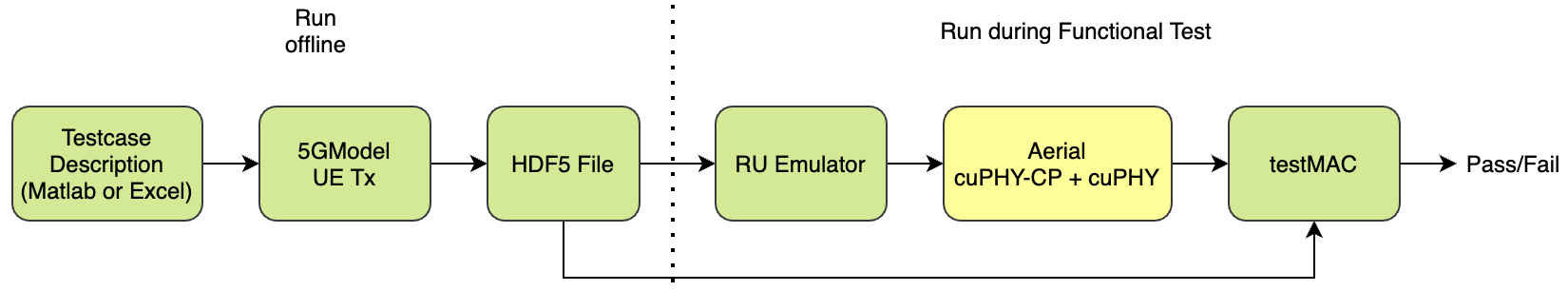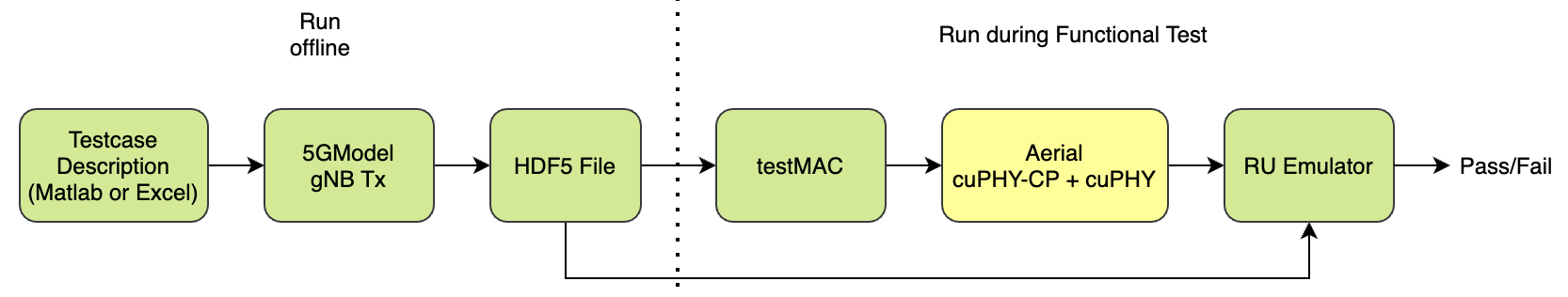For real-time functional correctness testing, test cases are generated offline in HDF5 binary file format, then played back in real-time through the testMAC and RU Emulator applications. The Aerial cuPHY-CP + cuPHY components under test are run in real-time to exercise the GPU and Fronthaul Network interfaces. Test case sequencing is enabled through configurable launch pattern files read by testMAC and RU Emulator. The diagram below shows an example of downlink functional testing: