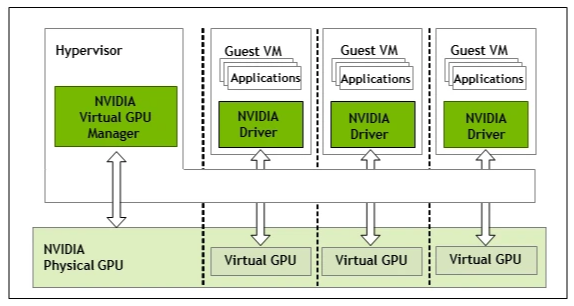 Under the NVIDIA Virtual GPU Manager on the hypervisor, one physical GPU can expose multiple vGPUs, each attachable to a guest VM as its own GPU device.