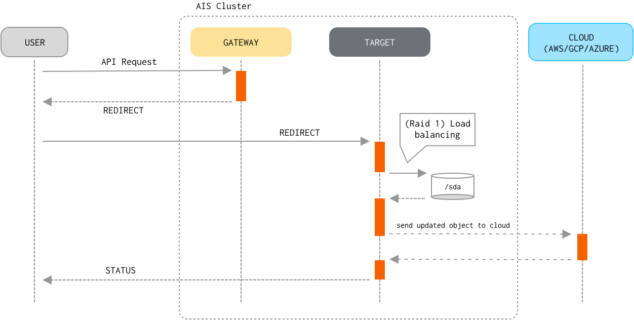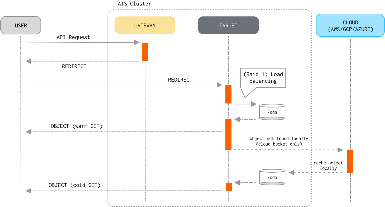 GETorPUTrequest to any of the AIStore proxies/gateways. - The proxy determines the storage target it must redirect the request to, the steps including: