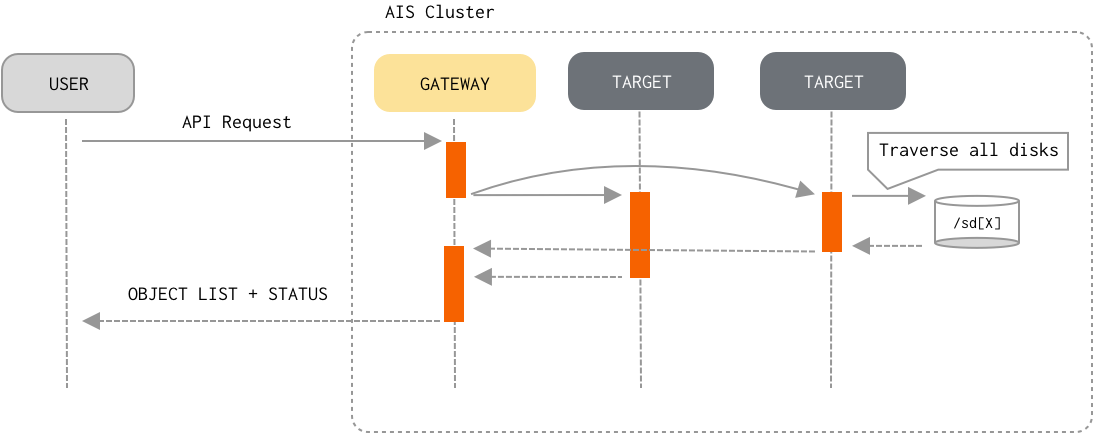 In contrast with the Read and Write datapath, list-objects flow “engages” all targets in the cluster (and, effectively, all clustered disks). To optimize (memory and networking-wise) and speed-up the processing, AIS employs a number of (designed-in) caching and buffering techniques: