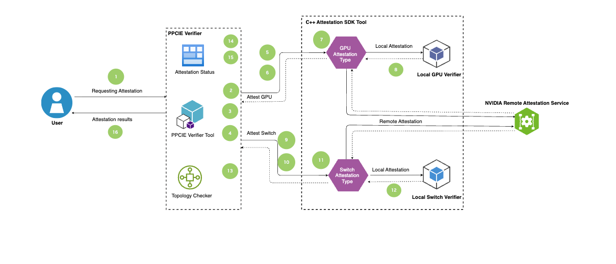 GPU attestation is initiated by the Attestation SDK: the Local GPU Verifier is used for local attestation, while NRAS (NVIDIA’s Remote Attestation Service) is used for remote attestation.