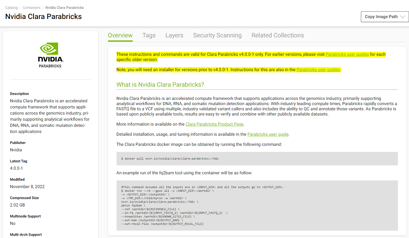 Visit the Parabricks page on NGC to get the Docker pull command for the latest version of Parabricks.