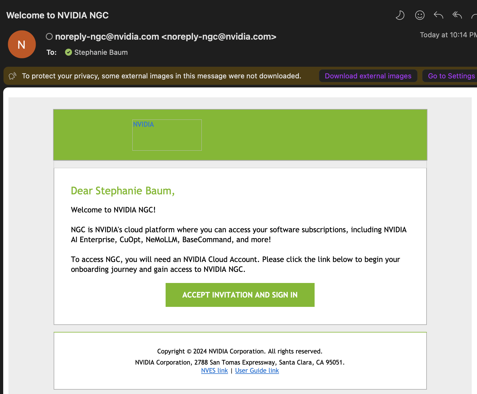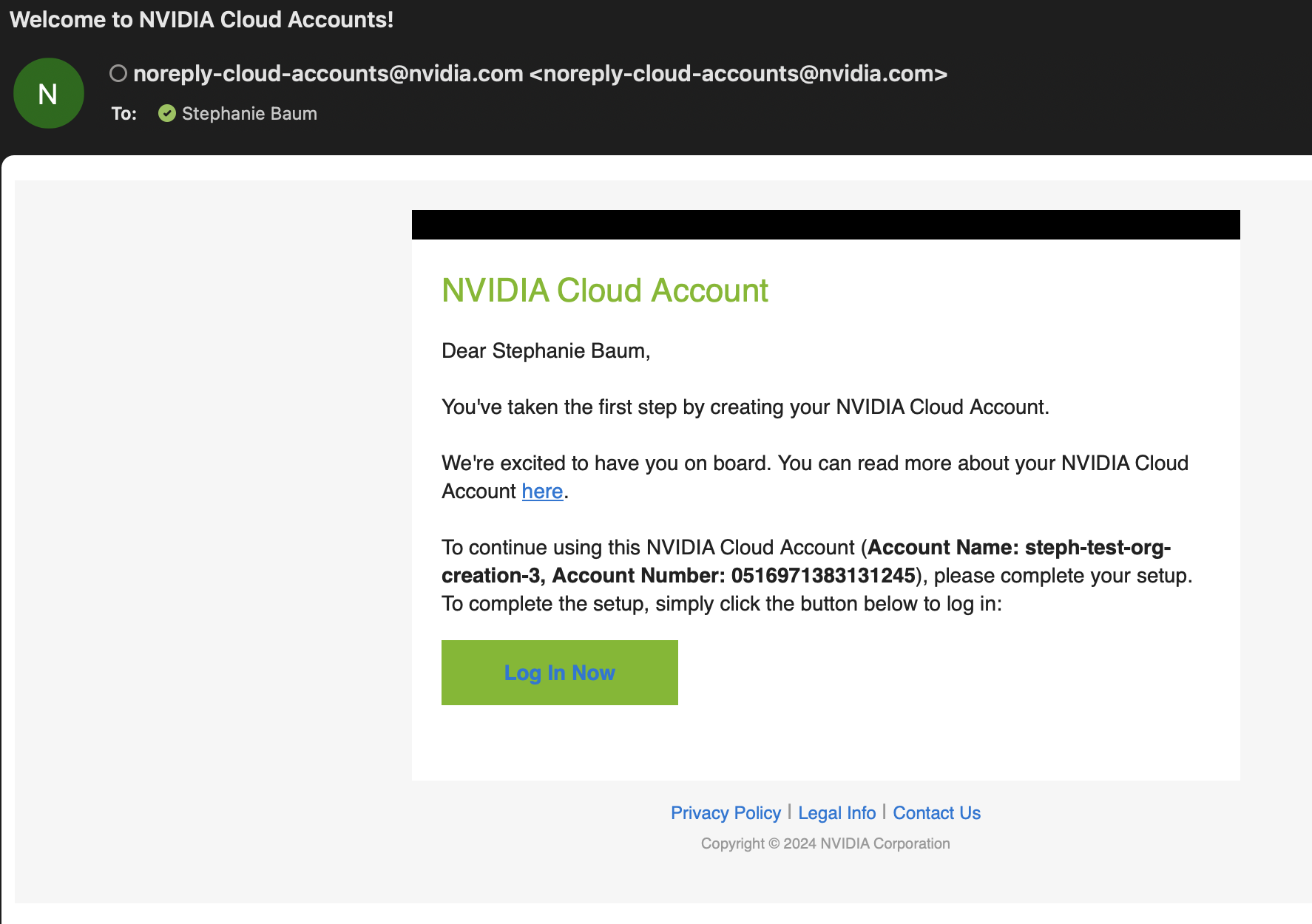 You will receive another email asking to log in to finish setup. This step activates your NVIDIA Cloud Account for future use. Click the button to login.