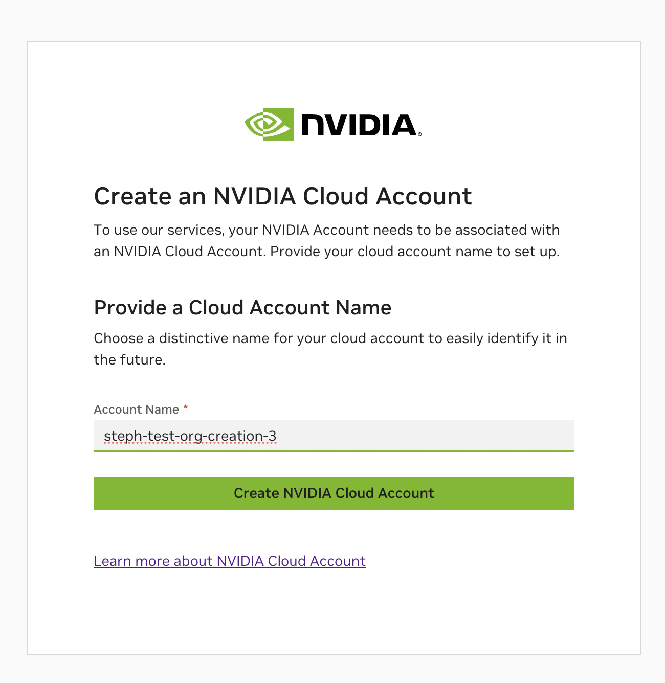 The next step will then ask you to enter an account name for your NCA. This account name will be linked to your NGC organization.