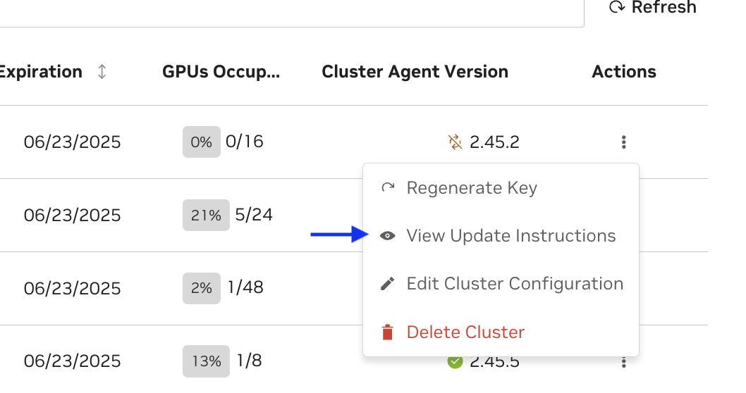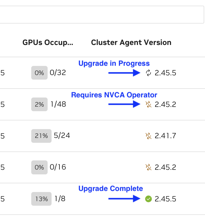 NVCA upgrades available are indicated in the UI by status icons next to the cluster’s NVCA version.