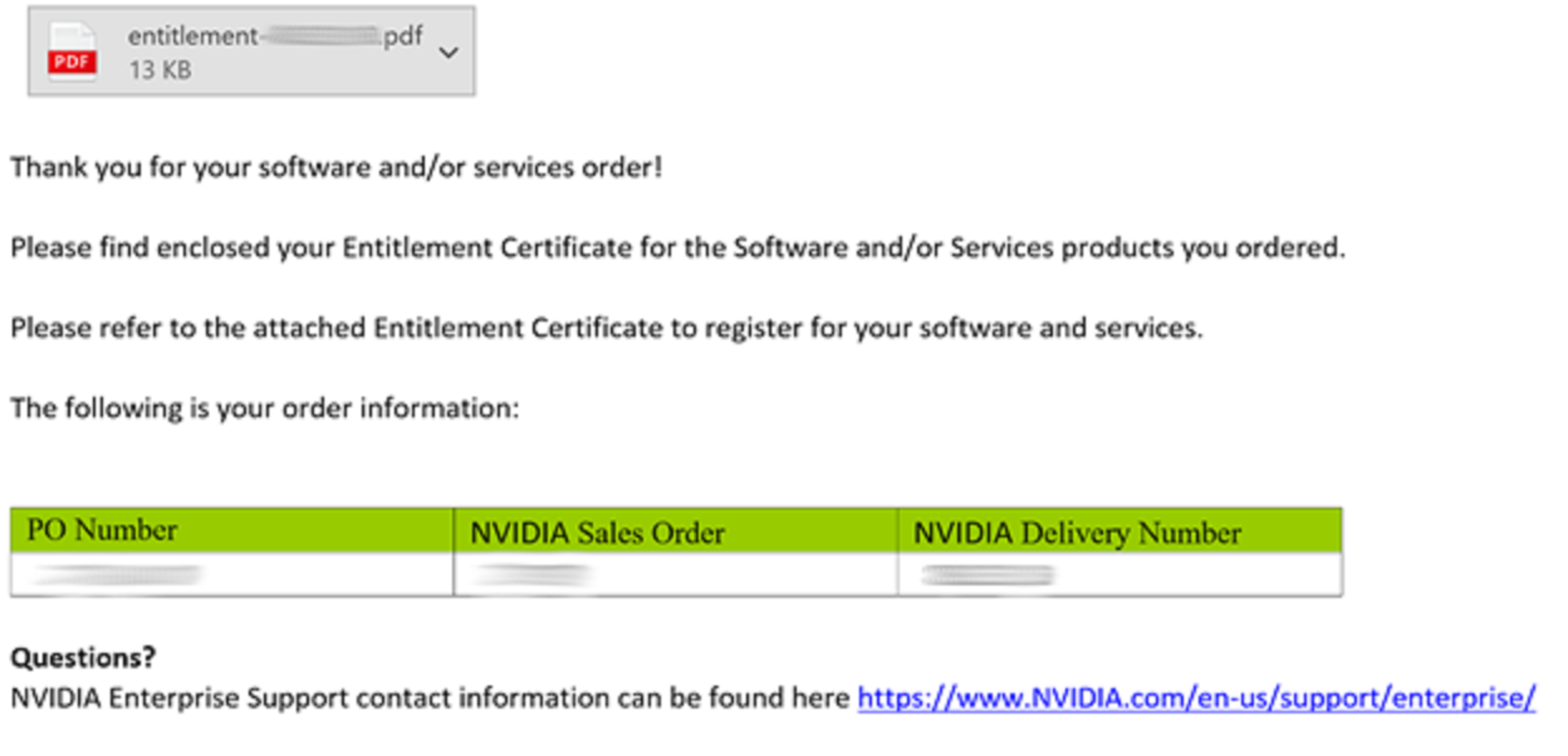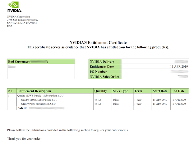 After your order for NVIDIA vGPU software is processed, you will receive an order confirmation message to which your NVIDIA Entitlement Certificate is attached.