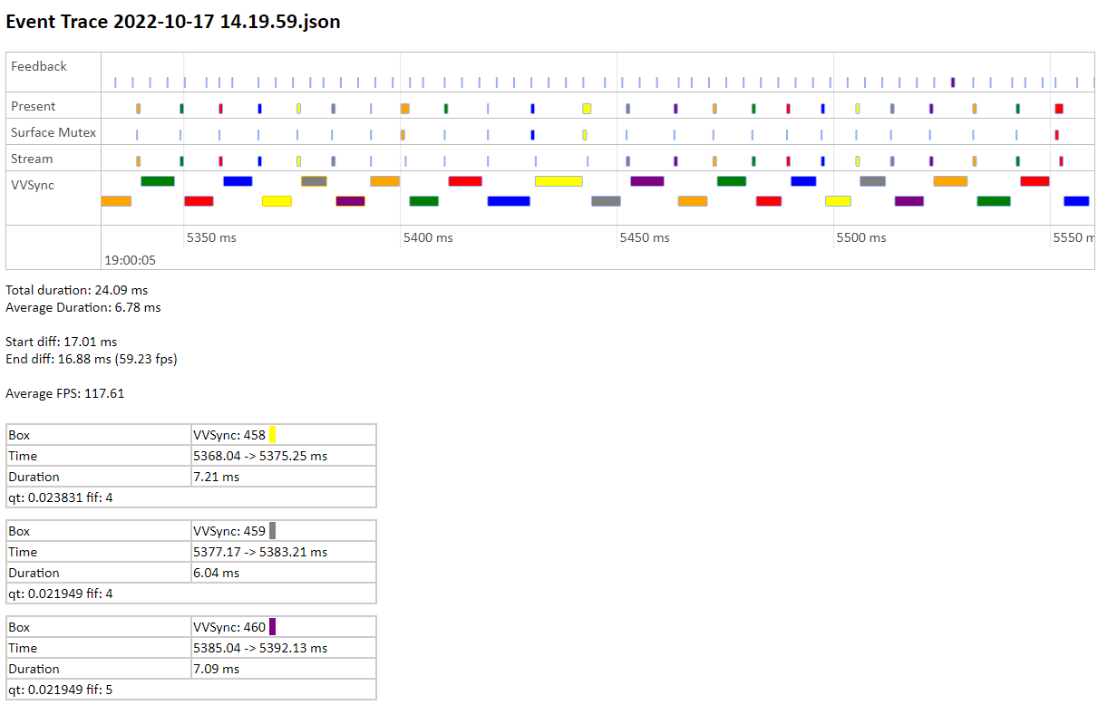 When you click on a colored box that represents an event, the profiler will display more detailed information such as the event name and ID, the start and end times of the event and total duration, and for frame data it includes the current resolution.