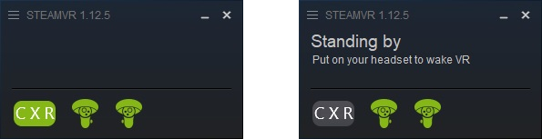 The headset icon at the bottom of the SteamVR mini window changes to indicate that CloudXR has been installed and is active. The icon displays the letters CXR on the headset as shown in The CloudXR icon. The icon turns green when the headset is active and is greyed out when the headset is inactive. You will not see the icons in the SteamVR mini window until a client attempts to connect to the server.