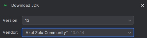The sample clients provided with CloudXR 4.0 use Gradle 6.1.1. Upgrading the projects to support Gradle may cause issues, but as of 2024, Android does not ship with a version of Java compatible with Gradle 6.1.1. A JDK of version 13 is known to work. You can download the JDK from within Android Studio.