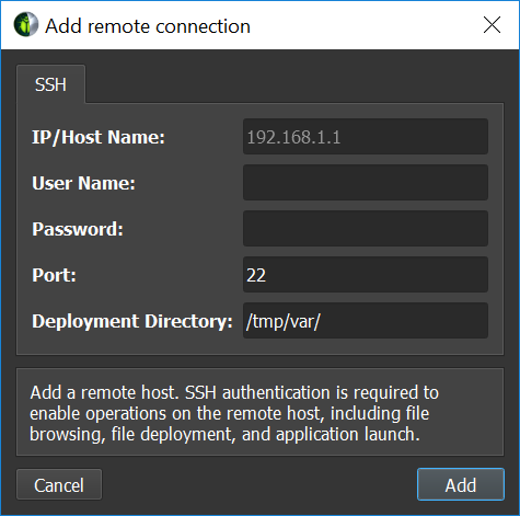 Remote devices that support SSH can also be configured as a target in the Connection Dialog. To configure a remote device, ensure an SSH-capable Target Platform is selected, then press the + button. The following configuration dialog will be presented.