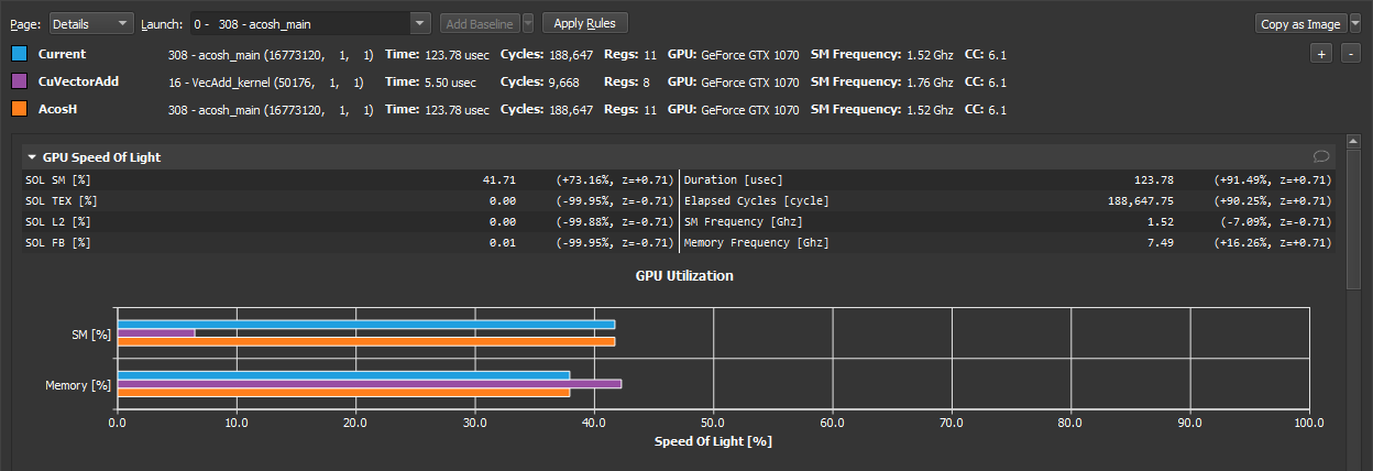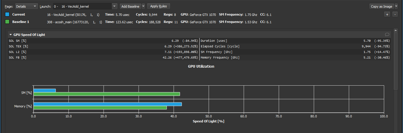 On the Details page, press the button Add Baseline to promote the current result in focus to become the baseline all other results from this report and any other report opened in the same instance of NVIDIA Nsight Compute gets compared to. If a baseline is set, every element on the Details page shows two values: The current value of the result in focus and the corresponding value of the baseline or the percentage of change from the corresponding baseline value.