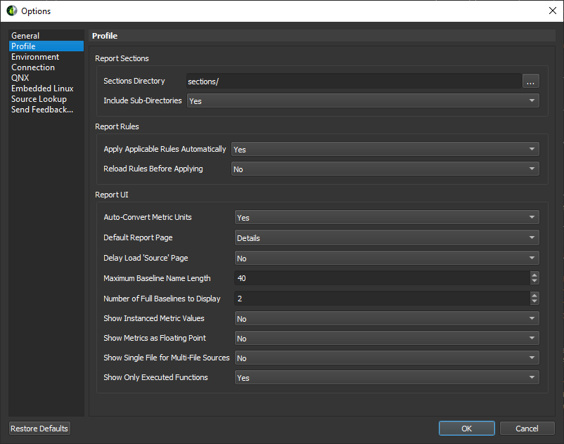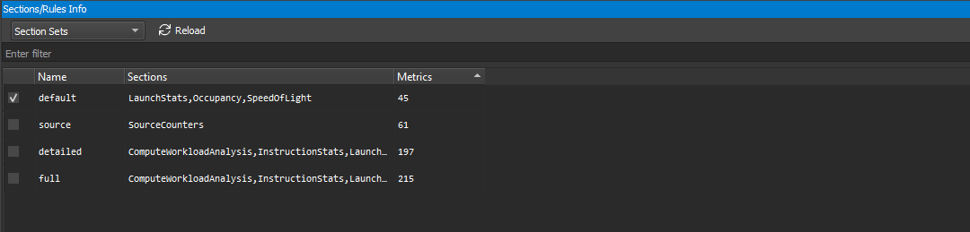 Whenever a kernel is profiled manually, or when auto-profiling is enabled, only sections enabled in the Sections/Rules view are collected. Similarly, whenever rules are applied, only rules enabled in this view are active. Note that sections associated with the default set are enabled by default.