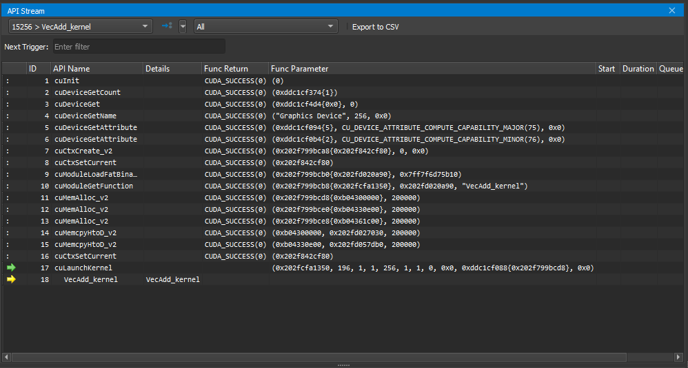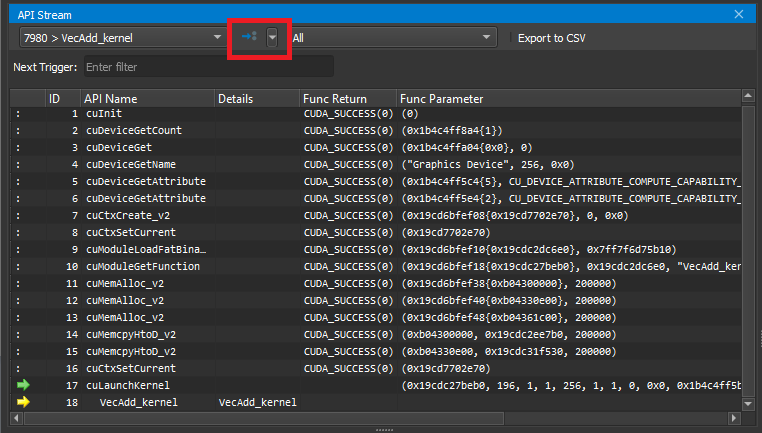 Use the Current Thread dropdown to switch between the active threads. The dropdown shows the thread ID followed by the current API name. One of several options can be chosen in the trigger dropdown, which are executed by the adjacent >> button. Next Kernel Launch resumes execution until the next kernel launch is found in any enabled thread. Next API Call resumes execution until the next API call matching Next Trigger is found in any enabled thread. Next Range Start resumes execution until the next start of an active profiler range is found. Profiler ranges are defined by using the cu(da)ProfilerStart/Stop API calls. Next Range Stop resumes execution until the next stop of an active profiler range is found. The API Level dropdown changes which API levels are shown in the stream. The Export to CSV button exports the currently visible stream to a CSV file.