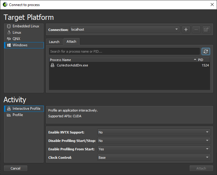 Select Attach to attach the profiler to an application already running on the target platform. This application must have been started using another NVIDIA Nsight Compute CLI instance. The list will show all application processes running on the target system which can be attached. Select the refresh button to re-create this list.