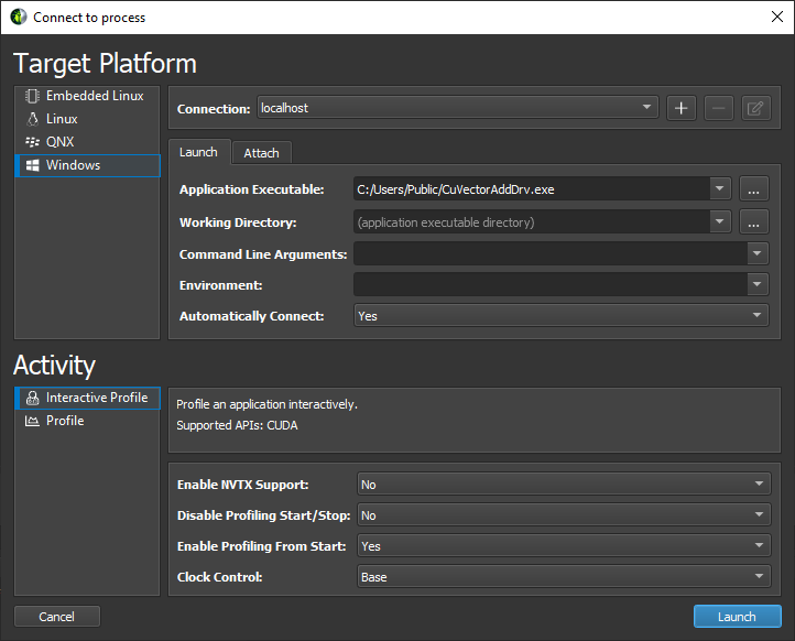 Depending on your target platform, select either Launch or Remote Launch to launch an application for profiling on the target. Note that Remote Launch will only be available if supported on the target platform. Fill in launch details for the application, such as the executable, working directory, command line arguments etc.