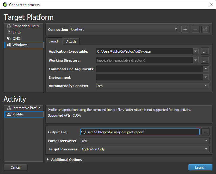 When starting NVIDIA Nsight Compute, the Welcome Page will appear. Click on Quick Launch to open the Connection dialog. If the Connection dialog doesn’t appear, you can open it using the Connect button from the main toolbar, as long as you are not currently connected. Select your target platform on the left-hand side and your localhost from the Connection drop down. Then, fill in the launch details and select Launch. In the Activity panel, select the Profile activity to initiate a session that pre-configures the profile session and launches the command line profiler to collect the data. Provide the Output File name to enable starting the session with the Launch button.