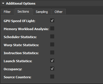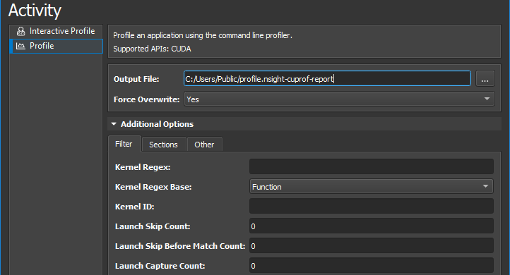 The expander at the bottom of the activity pane can be used to show additional configuration options. For more details on these options see the Command Line Options of the command line profiler. The options are grouped into tabs: The Filter tab exposes the options to specify which kernels should be profiled. Options include the kernel regex filter, the number of launches to skip, and the total number of launch to profile. The Section tab allows you to select which sections should be collected for each kernel launch. The Other tab includes the option to collect NVTX information or custom metrics via the --metrics option.