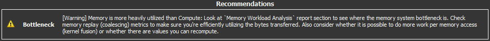 MemoryWorkloadAnalysis MemoryWorkloadAnalysis.section Detailed analysis of the memory resources of the GPU. Memory can become a limiting factor for the overall kernel performance when fully utilizing the involved hardware units (Mem Busy), exhausting the available communication bandwidth between those units (Max Bandwidth), or by reaching the maximum throughput of issuing memory instructions (Mem Pipes Busy). Depending on the limiting factor, the memory chart and tables allow to identify the exact bottleneck in the memory system.