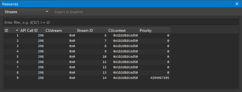 Using the dropdown on the top, different views can be selected, where each view is specific to one kind of resource (context, stream, kernel, …). The Filter edit allows you to create filter expressions using the column headers of the currently selected resource.