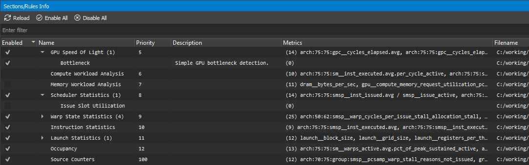 The enabled states of sections and rules are persisted across NVIDIA Nsight Compute launches. The Reload button reloads all sections and rules from disk again. If a new section or rule is found, it will be enabled if possible. If any errors occur while loading a rule, they will be listed in an extra entry with a warning icon and a description of the error.
