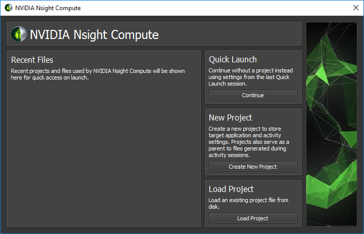 After starting NVIDIA Nsight Compute, by default the Welcome Page is opened. It provides links to recently opened reports and projects as well as quick access to the Connection Dialog, and the Projects dialogs. To immediately start a profile run, select Continue under Quick Launch. See Environment on how to change the start-up action.