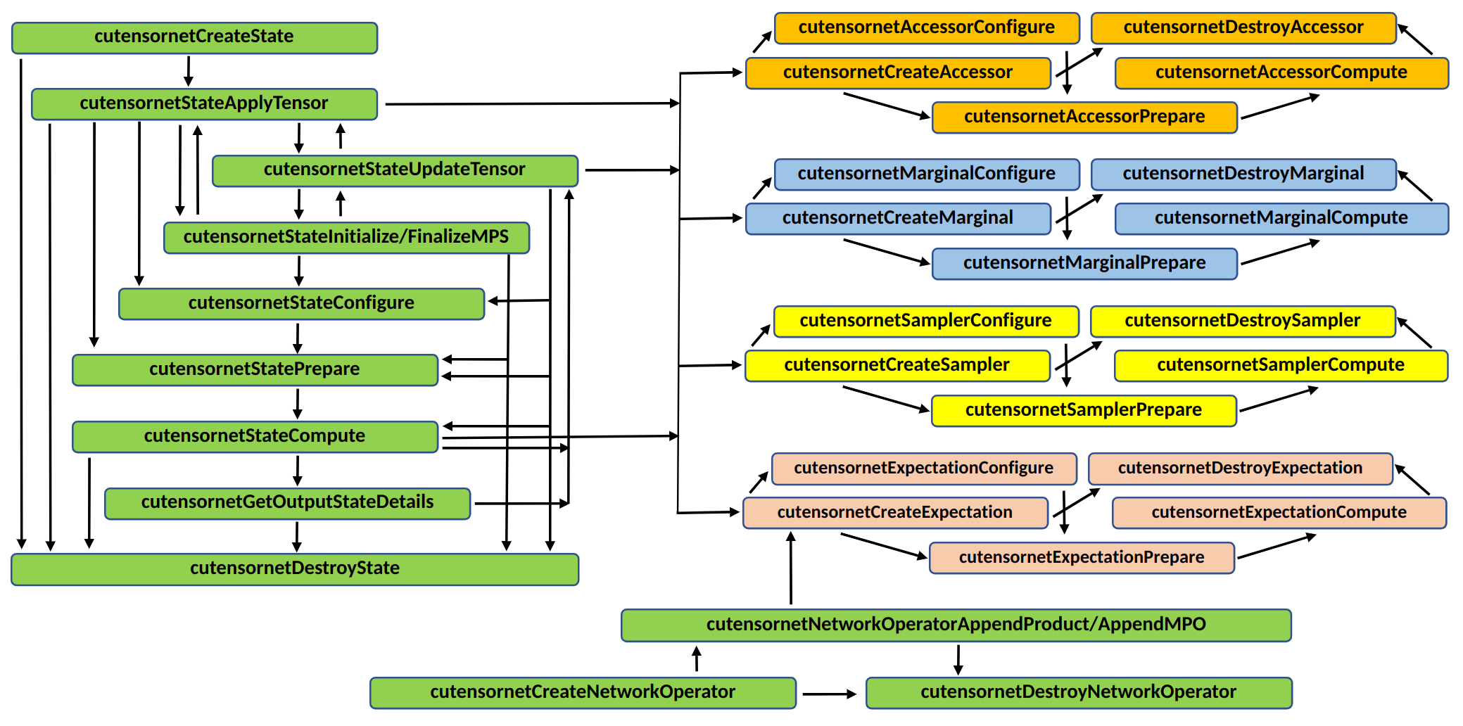 Since cuTensorNet v2.9.0, the network-centric API (cutensornetCreateNetwork and the family of functions prefixed with cutensornetNetwork*) is the preferred way to define, prepare, and execute contractions and gradients. The legacy descriptor/plan-based APIs remain available for backward compatibility but are deprecated.