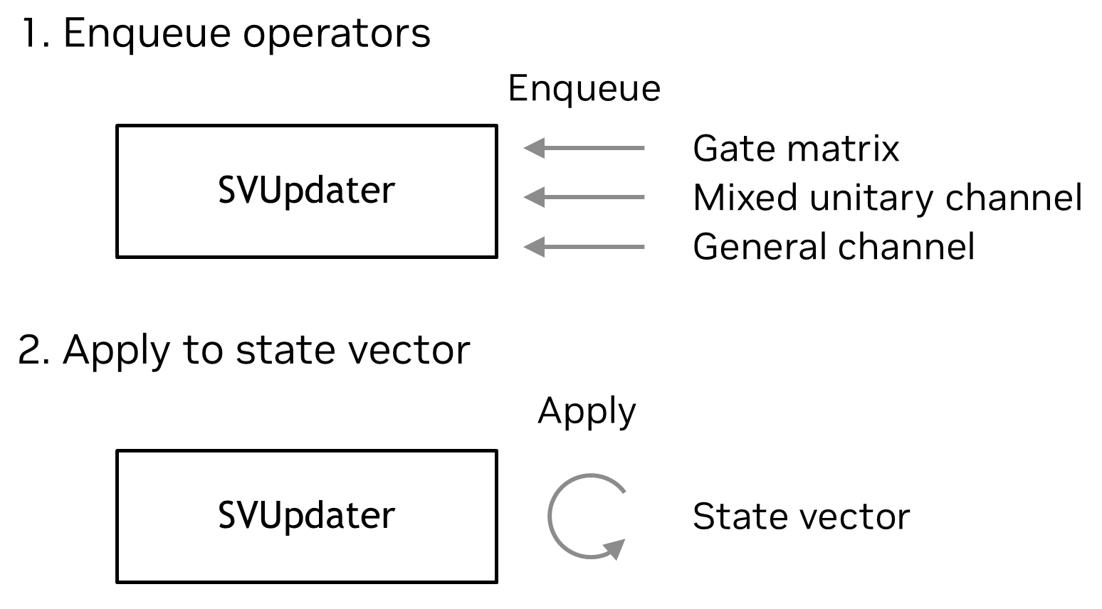 Figure. SVUpdater workflow showing the two-step process: (1) Enqueue operators - gate matrices, mixed unitary channels, and general channels are queued into the SVUpdater; (2) Apply to state vector - the queued operations are applied to update the state vector with optimized fusion and execution.#