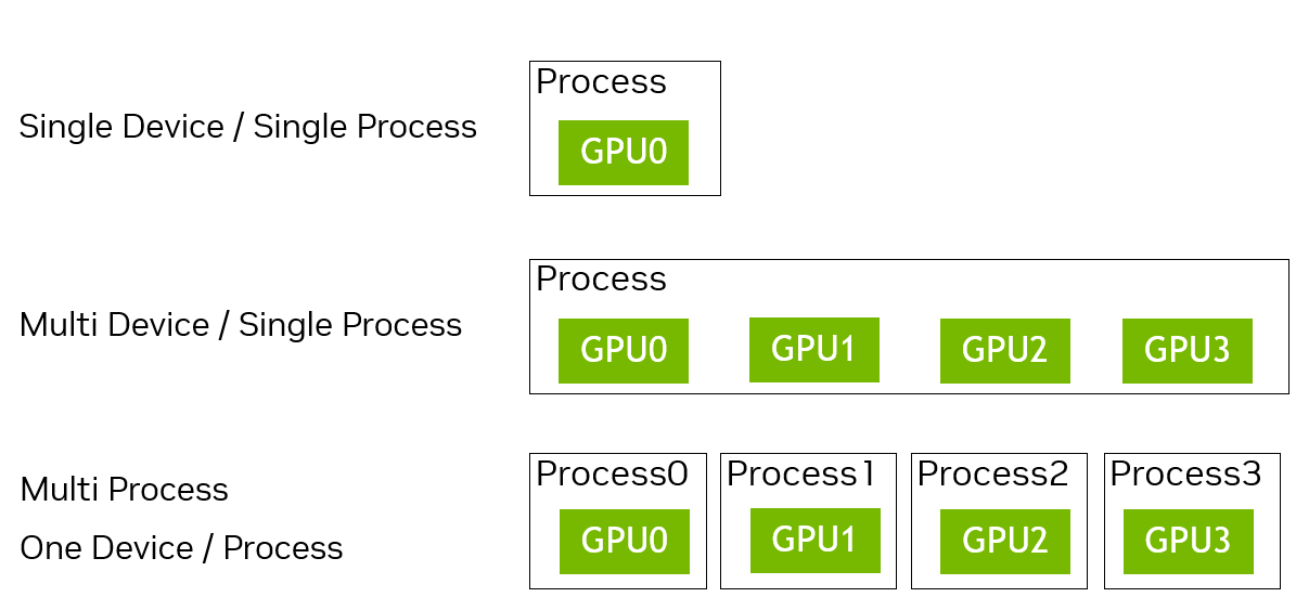 • Utilizes devices in a single hardware box connected via NVLink and/or PCIe.