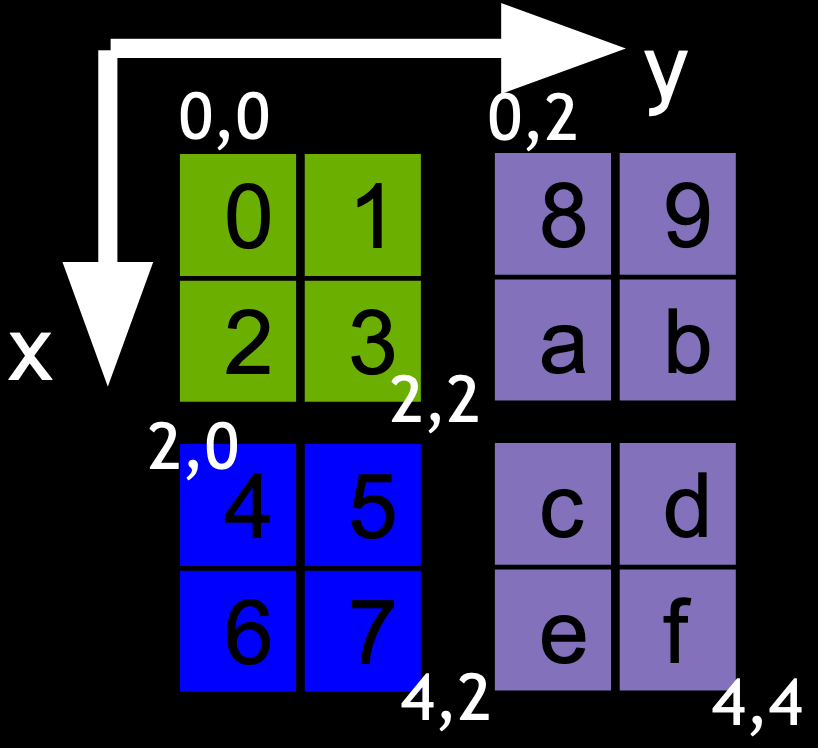 By associating box 0 to process 0, box 1 to process 1 and box 2 to process 2, this creates a data distribution of the global 4*4 array across three processes. The same process can be generalized to a 3D array.