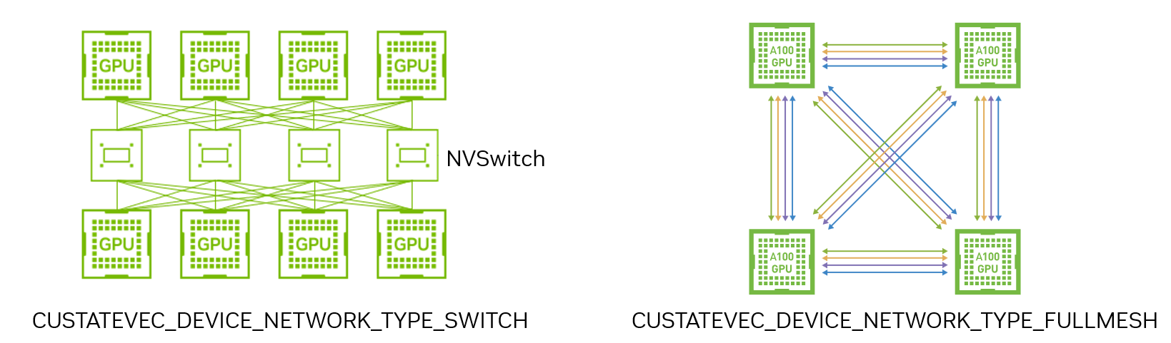 The device network type is chosen by specifying CUSTATEVEC_DEVICE_NETWORK_TYPE_SWITCH or CUSTATEVEC_DEVICE_NETWORK_TYPE_FULLMESH to the networkType argument in custatevecExConfigureStateVectorMultiDevice().