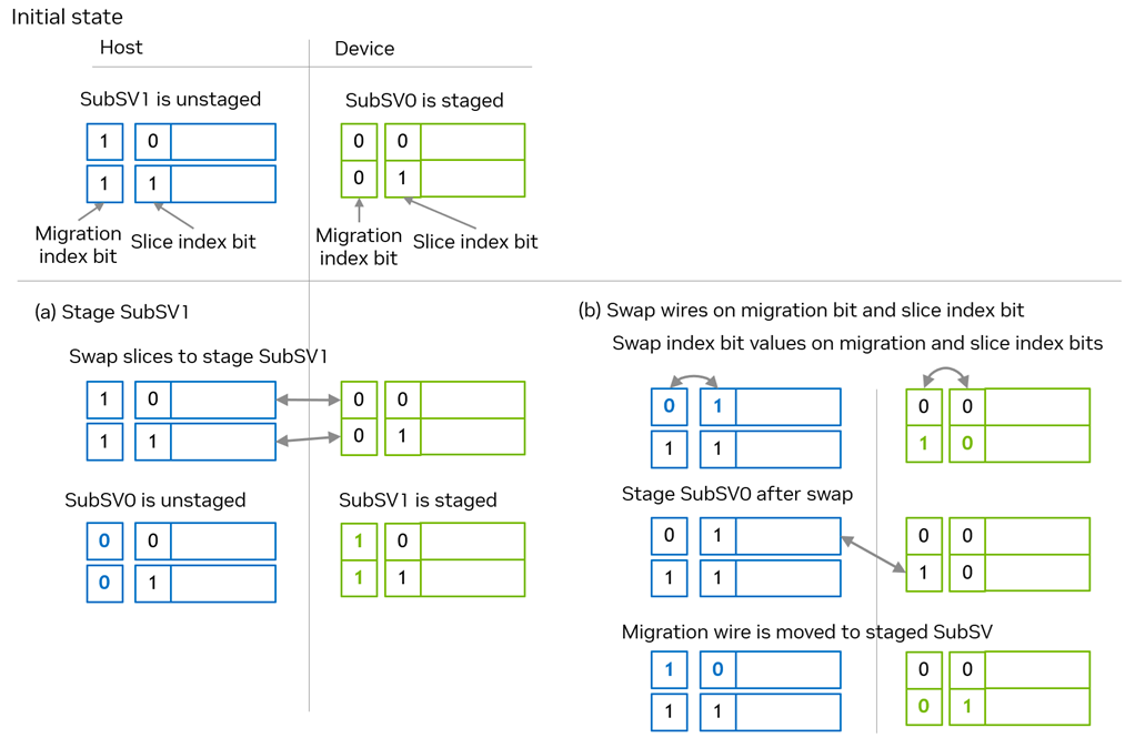 When staging SubSV1 onto device, slices are swapped between host and device as shown in the figure below (a). After the swap, SubSV1 is staged on device and SubSV0 moves to host.