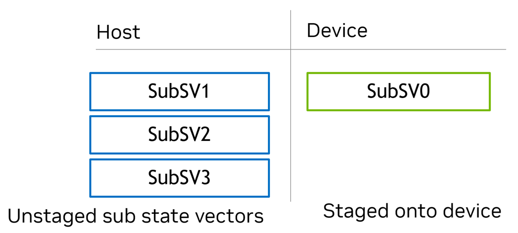 State vector with host memory (2 migration wires). SubSV0 is staged on device, and SubSV1-3 are unstaged on host.#