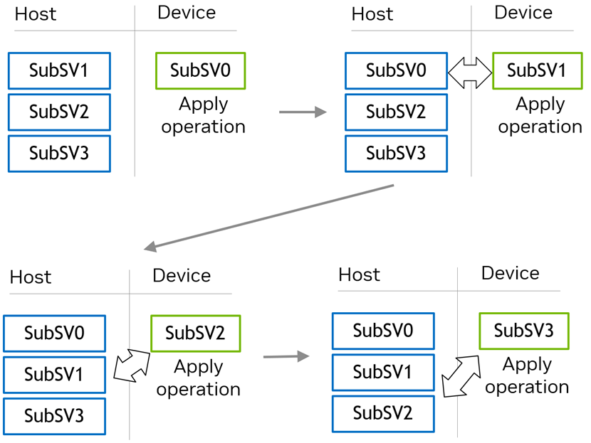 When staging SubSV1 onto device, slices are swapped between host and device as shown in the figure below (a). After the swap, SubSV1 is staged on device and SubSV0 moves to host.