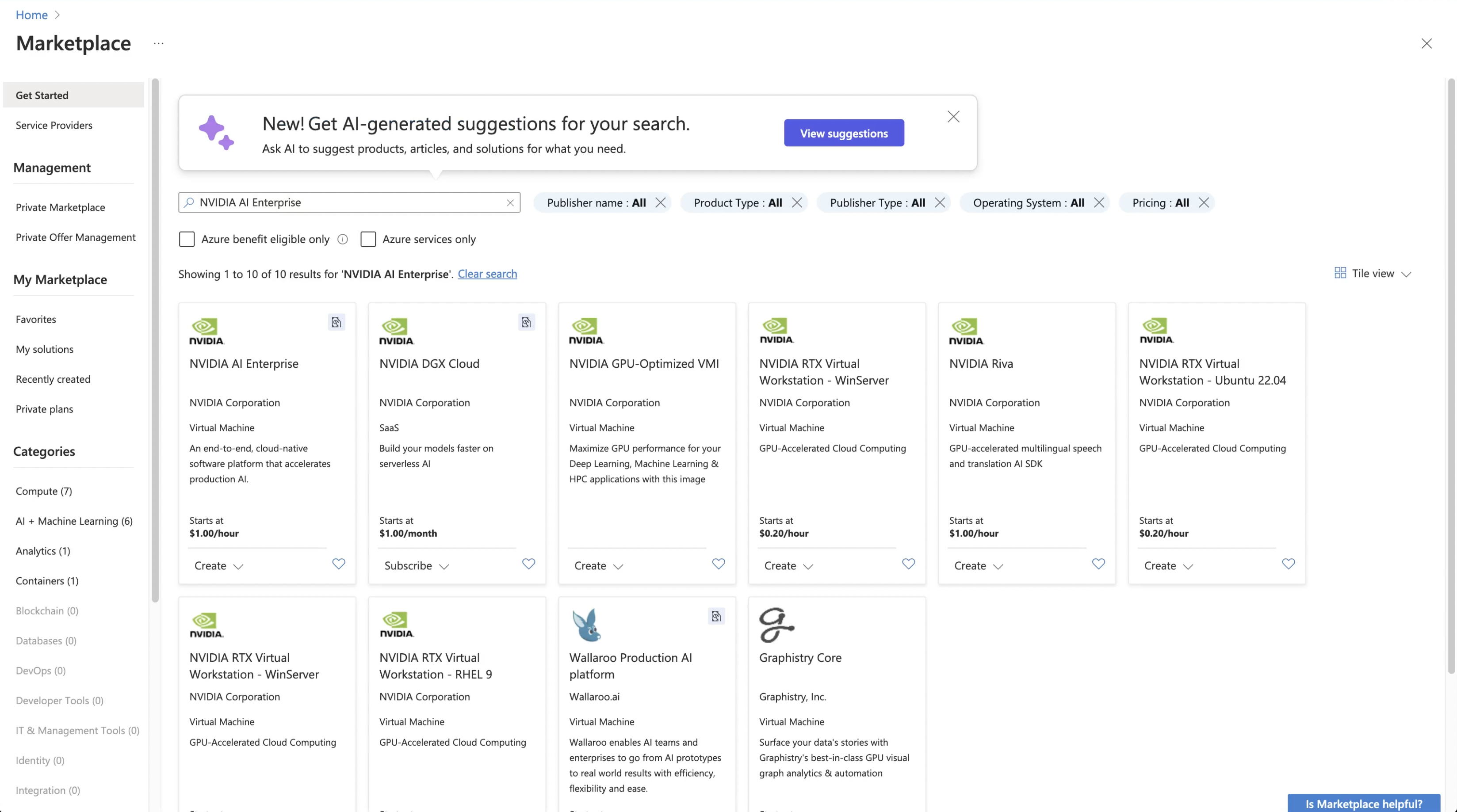 3. You should see the following results. Click on the first option, the NVIDIA AI Enterprise Virtual Machine.