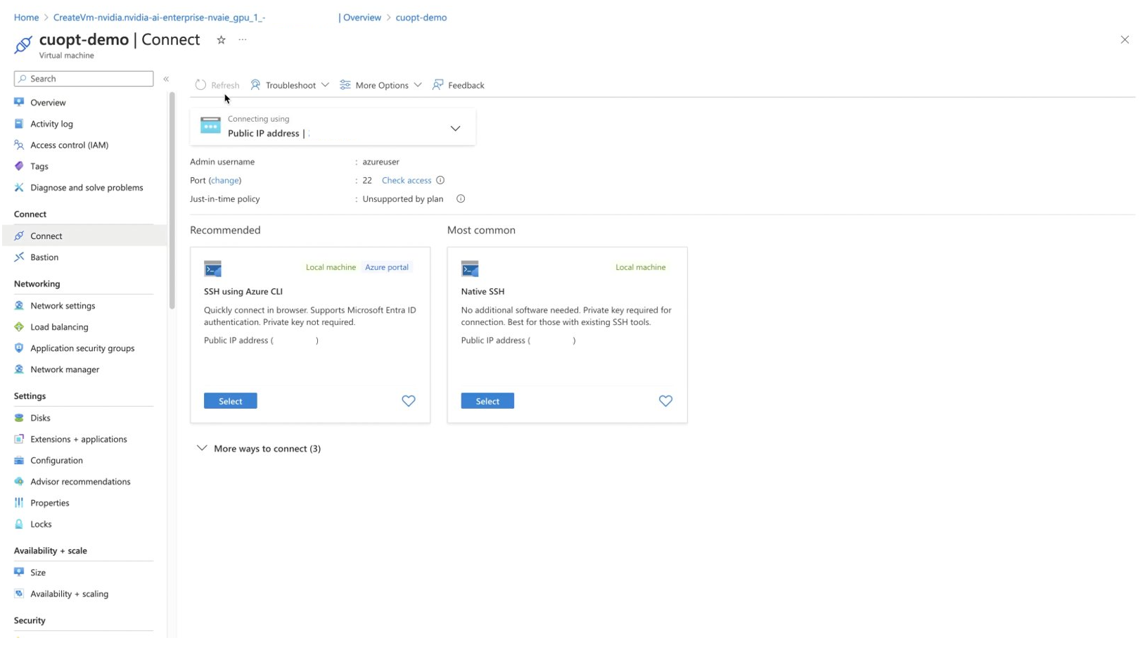 You can connect to the VM through Azure CLI or through your terminal (Native SSH). The public IP address of your VM is written at the top of the page.