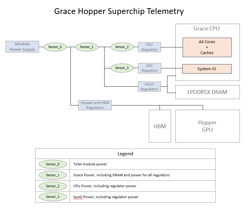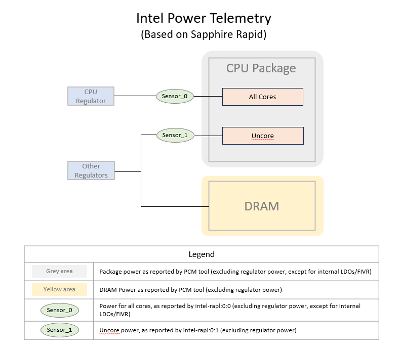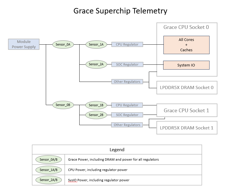 As illustrated in the graphic above, the power consumption per socket does not include regulator losses, and so is not directly comparable to the CPU Power Socket 0 and CPU Power Socket 1 telemetry as described in the Available Power Telemetries table above. To compare Intel CPU power consumption to Grace CPU power, remove the Grace regulator losses.