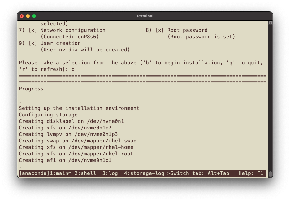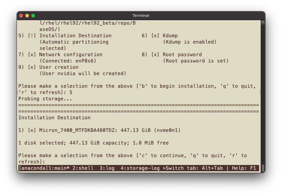 nr_cpus=72to avoid a hang during installation. Refer to Knowledgebase for more information.To automate the installation with a Kickstart configuration file, refer to Installing with Kickstart.