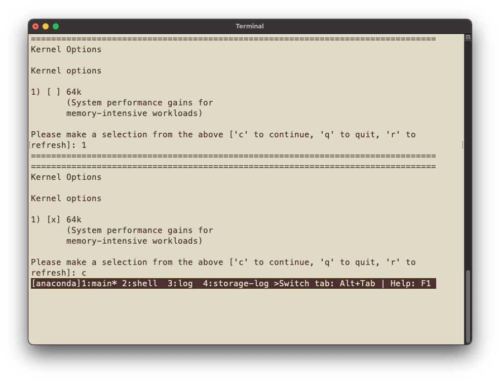 After the system reboots, log in and install the 64k kernel as the default by running the following commands: