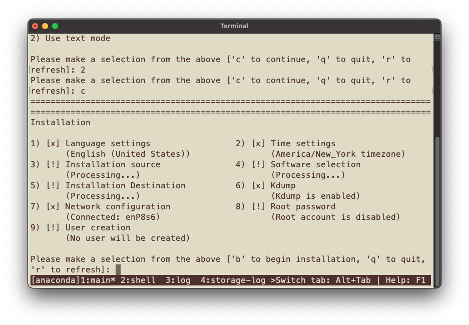 If the installer menu fails to start, check the KVM console to continue installation. The installation mode can be specified by modifying the GRUB entry to add the