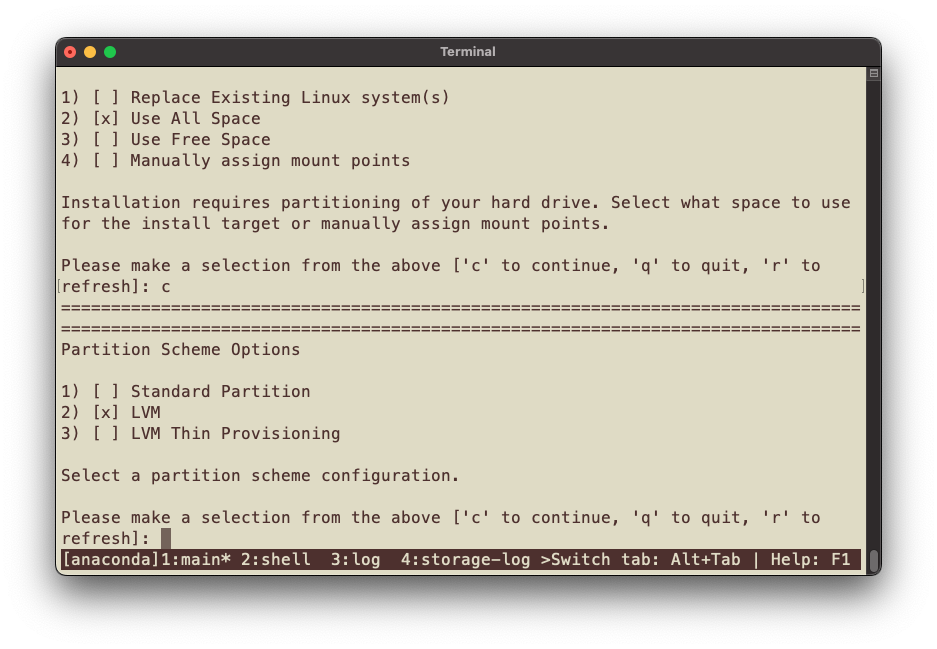 Select the installation destination, the partitioning scheme, and partitioning options.