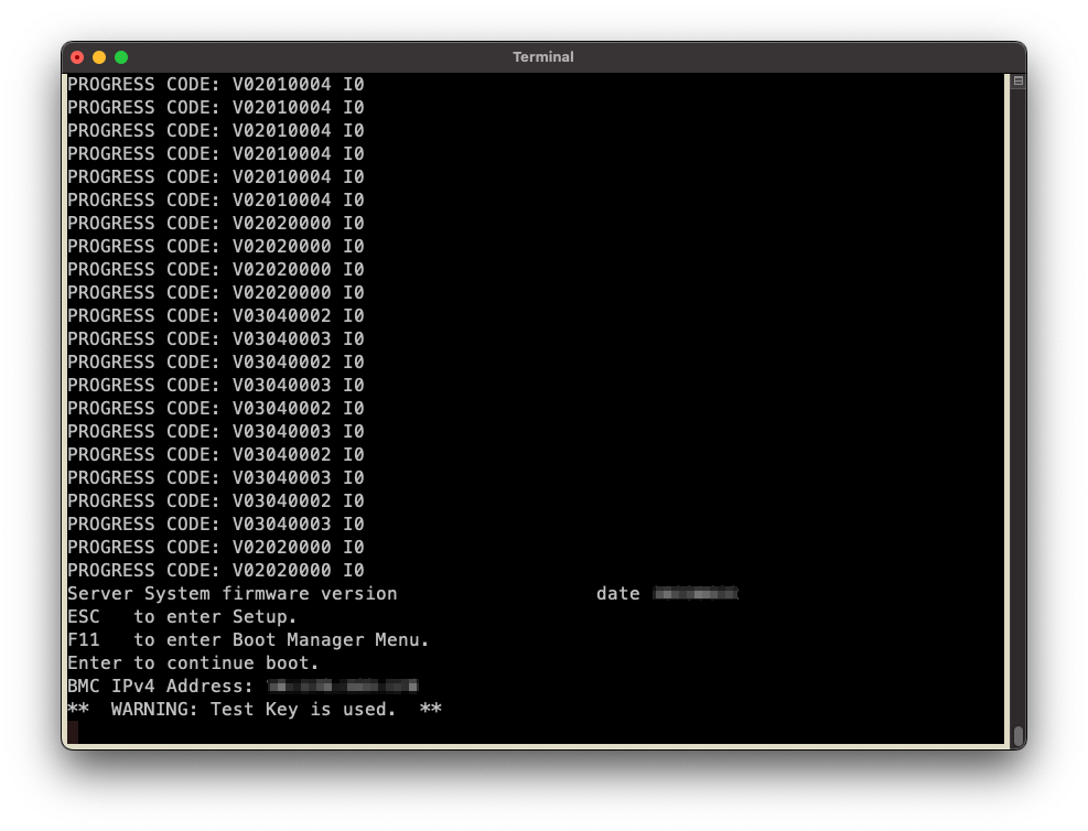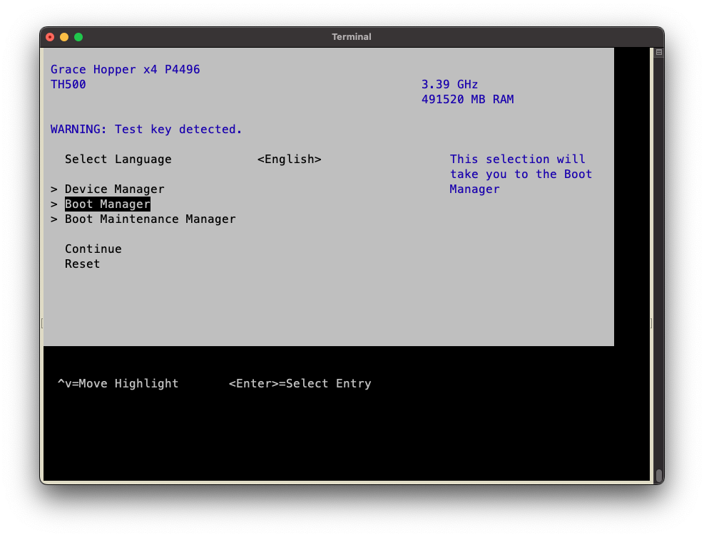 c. In the boot menu, select UEFI OpenBMC Virtual Media Device as the boot device and press Enter.