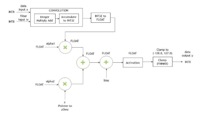When the data input x, the filter input w, and the output y are all in INT8 data type, the function cudnnConvolutionBiasActivationForward() will perform the type conversion. Accumulators are 32-bit integers that wrap on overflow.