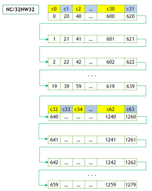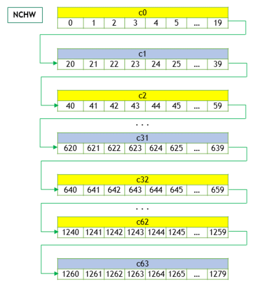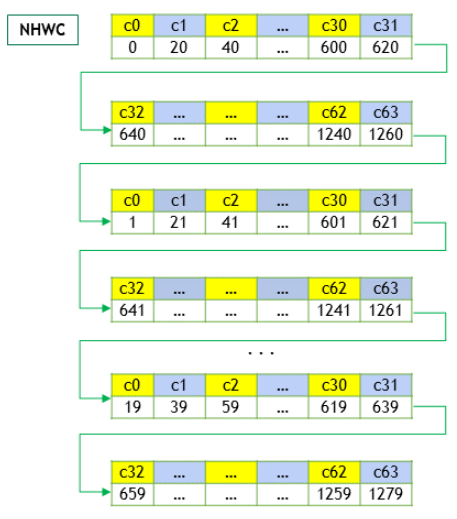 The NC/32HW32 is similar to NHWC, with a key difference. For the NC/32HW32 memory layout, the 64 channels are grouped into two groups of 32 channels each - first group consisting of channels c0 through c31, and the second group consisting of channels c32 through c63. Then each group is laid out using the NHWC format.