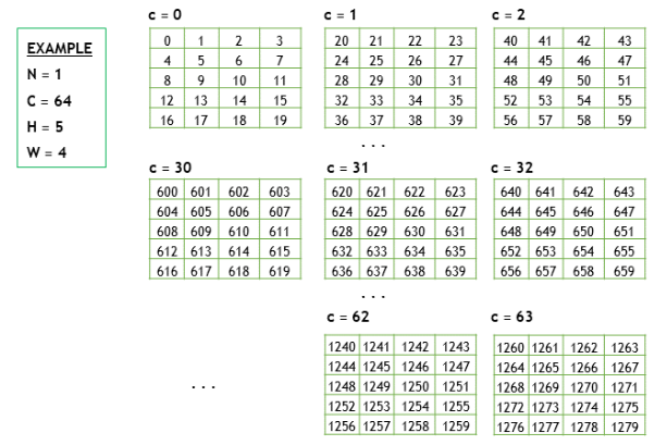 The NC/32HW32 is similar to NHWC, with a key difference. For the NC/32HW32 memory layout, the 64 channels are grouped into two groups of 32 channels each - first group consisting of channels c0 through c31, and the second group consisting of channels c32 through c63. Then each group is laid out using the NHWC format.