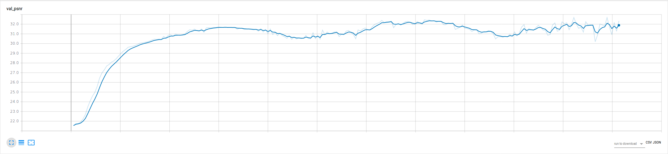 Example validation PSNR (fp16, batch size 7, min_lr=max_lr=0.001)