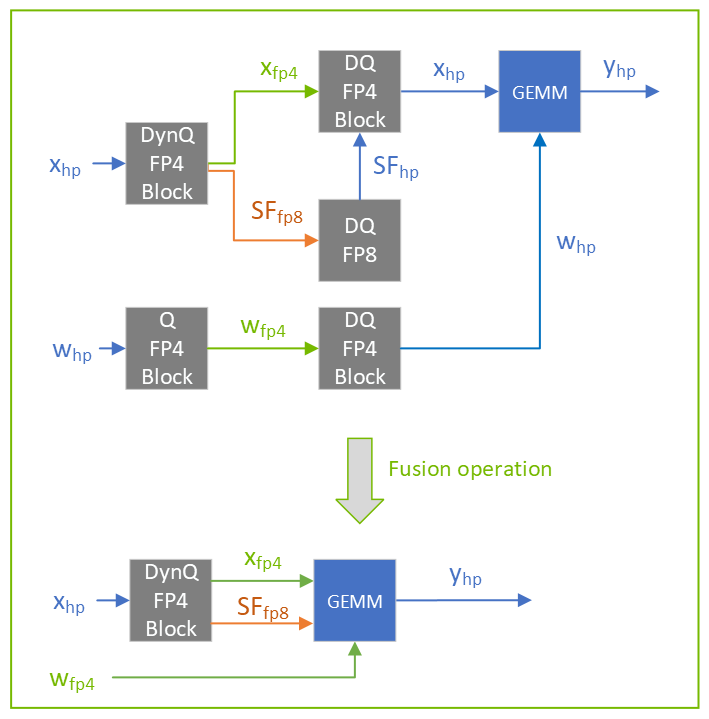 FP4 block quantization supports both weights and activations. To minimize the quantization error, it is recommended to use Dynamic Quantization for activations.