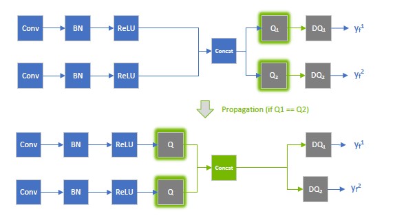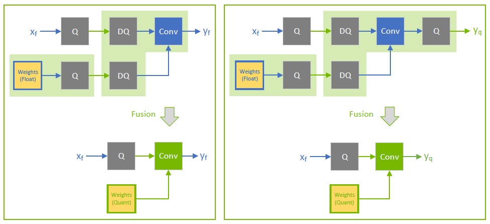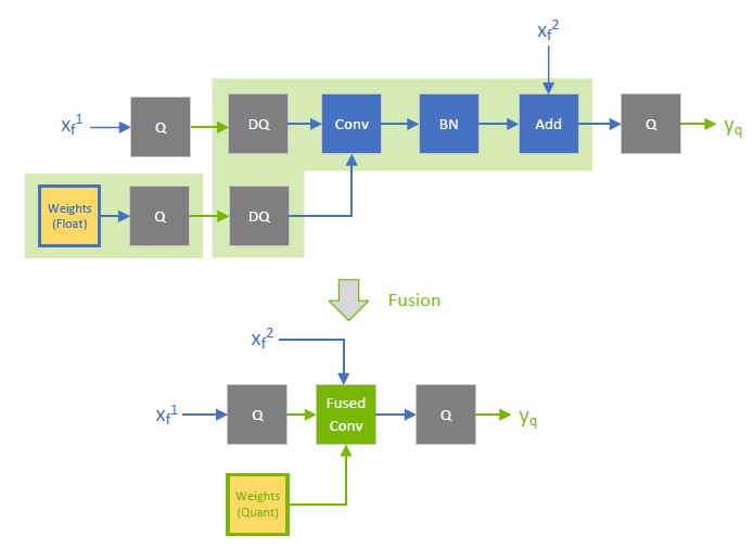 In contrast, when \(x_{f^{}}^{1}\) is quantized to INT8, as depicted in the following diagram, the output of the fused convolution is also INT8, and the trailing Q-layer is fused with the convolution.