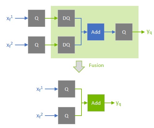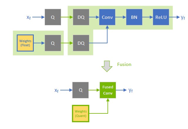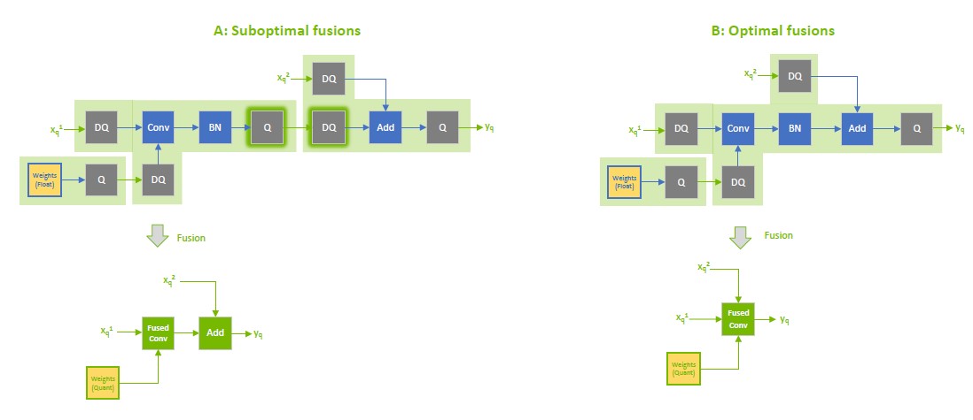 The following figure shows suboptimal fusions (the highlighted light green background rectangles) that can result from extra Q/DQ operations. The convolution is fused separately from the element-wise addition because Q/DQ pairs surround each other.
